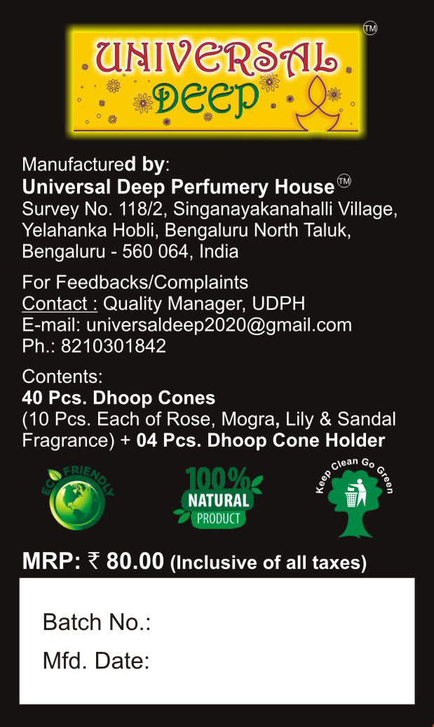 Universal Deep Dhoop Cones 4in1 (Sandal, Rose, Lily, Mogra) Fragrances, 40 Pcs. Pack